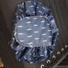 When open and spread out, our makeup bag is a large circle (18.5 inches, to be exact), so you can store your serums, mascaras, lipsticks, fragrance, and more in a large space. Once you’re done, simply pull the drawstring up and watch everything hold closed in one swift move. A velcro strap folds over to secure the bag (literally).