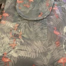 Our space-saving makeup bag comes in three patterns: fun pink flamingos, cool blue leaves, and a simple pink-and-white stripe.